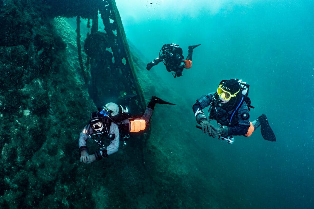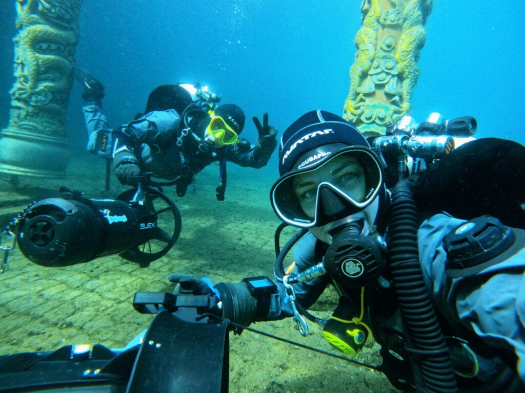 Reszta ekipy, czyli Martyna i ja, zaplanowałyśmy wspólne nurkowanie ze skuterami. Dla nas nie była to nowość – miałyśmy już wcześniej okazję nurkować z DPV. We dwie ruszyłyśmy w stronę zatopionej żaglówki, ciesząc się płynnym, dynamicznym przemieszczaniem, jakie daje nurkowanie ze skuterami. Miałyśmy również dopłynąć do ciężarówki, ale kiepska widoczność zmusiła nas do zawrócenia. Safety first!