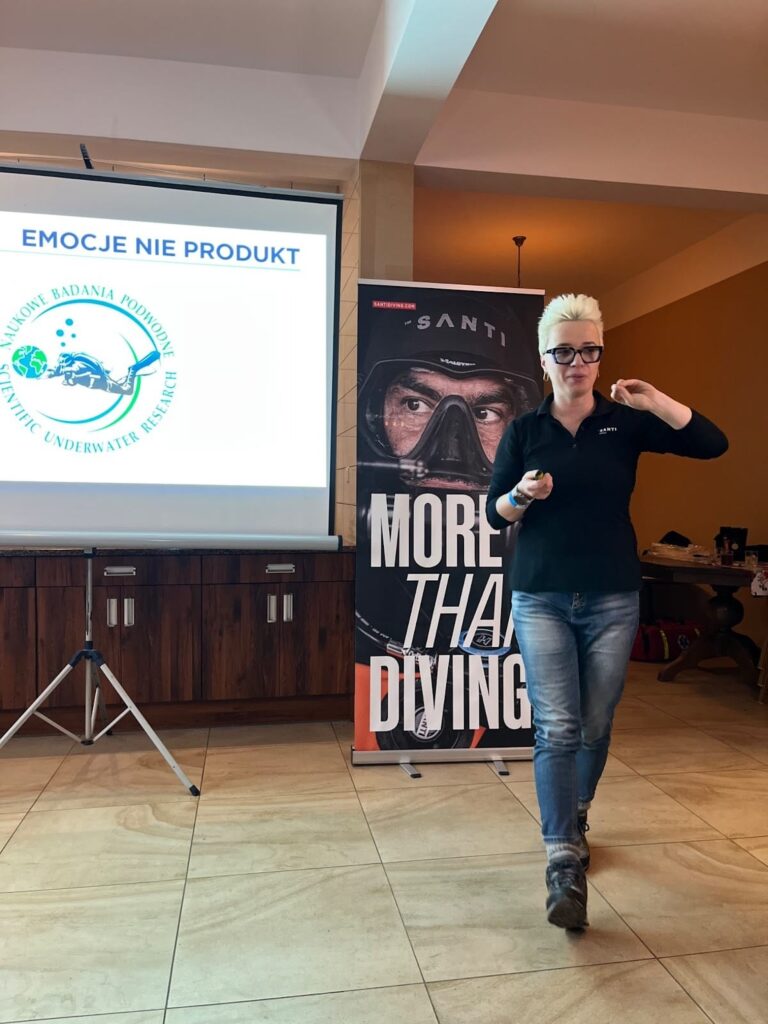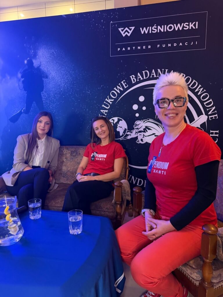 Tego dnia na mnie i Martynę czekało także nasze wystąpienie dotyczące stypendium Santi. Dołączyła do nas Helena, która opowiedziała o stypendium ze swojej perspektywy – jako osoba, która aplikowała i przeszła cały proces od środka. Bardzo ucieszyło mnie to, że publiczność była aktywna, padło wiele pytań, a zainteresowanie tematyką było naprawdę duże. Czułam, że dzielenie się możliwościami rozwoju w nurkowaniu może realnie inspirować innych do podejmowania kolejnych kroków. To było ogromnie budujące doświadczenie.